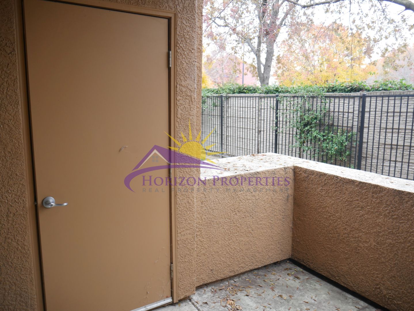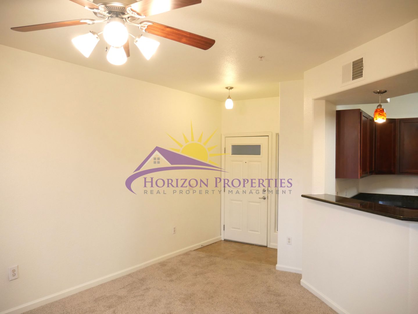 Near Natomas Boulevard and Club Center Drive in North Natomas, Sacramento, this modern 1st floor condominium offers one bedroom and one full bathroom. This home has central heat and air conditioning. The linoleum entry opens onto beige carpet, dual pane windows with curtains throughout 763 square feet of living space. The living room has a ceiling fan with overhead lighting. There is also a dining room with chandelier, built-in granite desk, and slider to the patio.