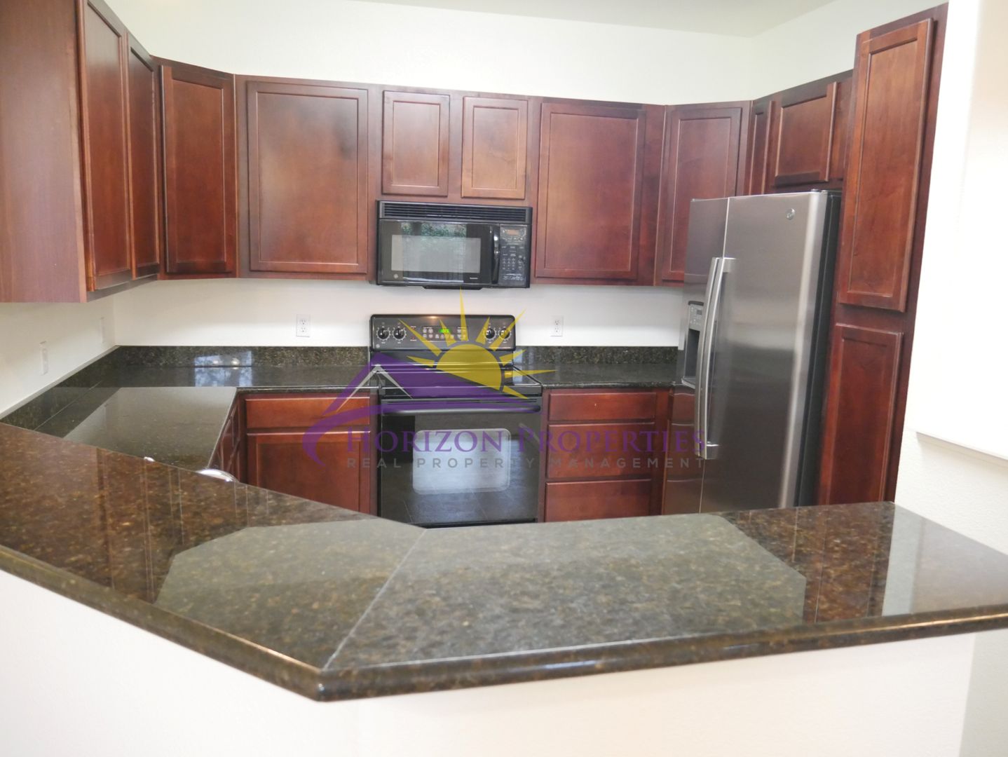 The eat-in kitchen has linoleum flooring, cherry cabinets, granite counters, pendant lighting, and is equipped with:
