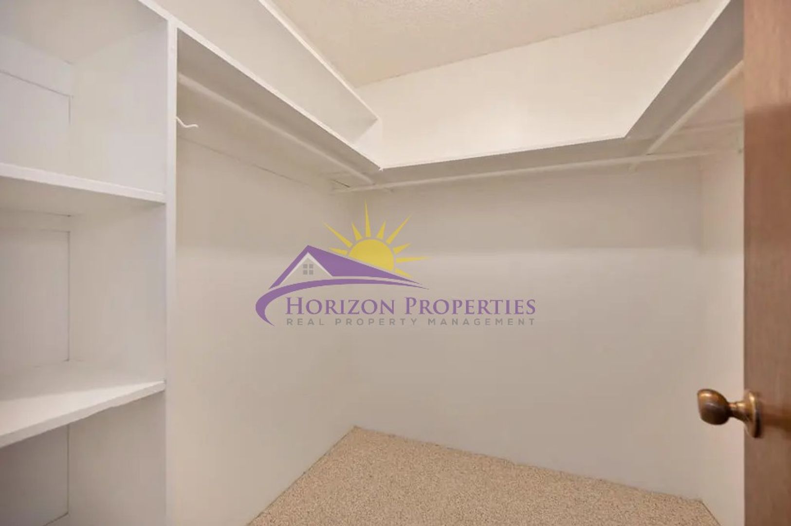 The first bedroom has overhead lighting and is attached to the bathroom. The second bedroom has a mirrored double-door closet that takes up the entire wall with lots of shelving. The bathroom has tile and laminate flooring, walk-in closet, shower over tub with glass doors, and two marble separate vanities.