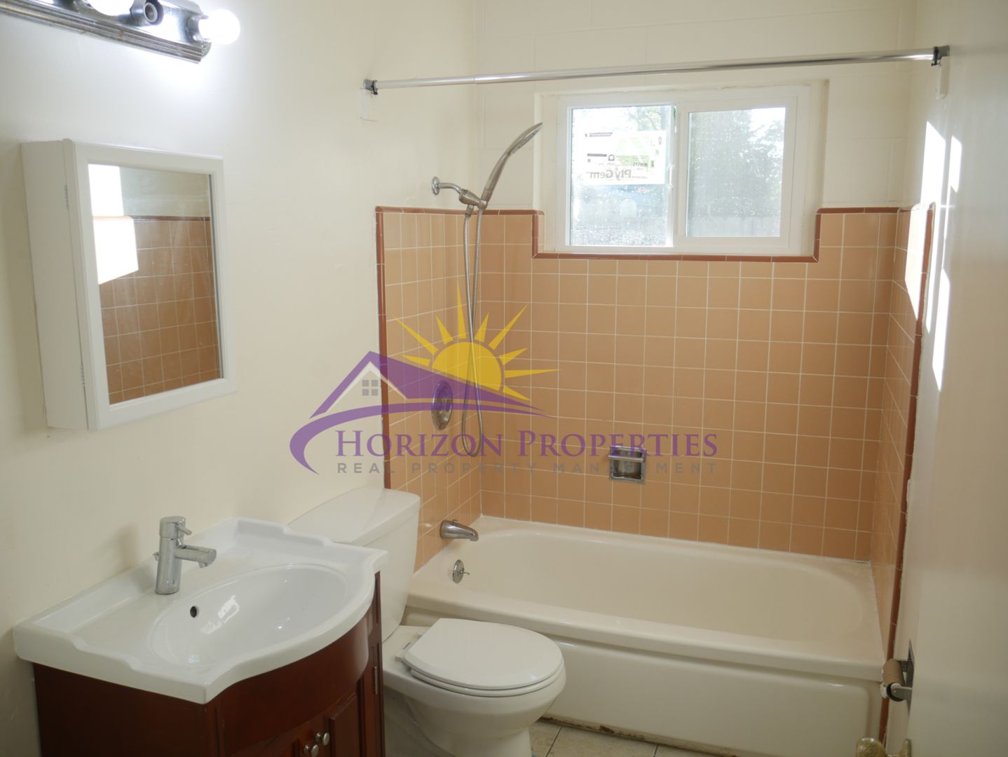 The bedrooms have double-door closets and overhead lighting. The bathroom has tile flooring, tile shower over tub, new medicine cabinet, and a new vanity. The hallway features built-in cabinets and shelves.