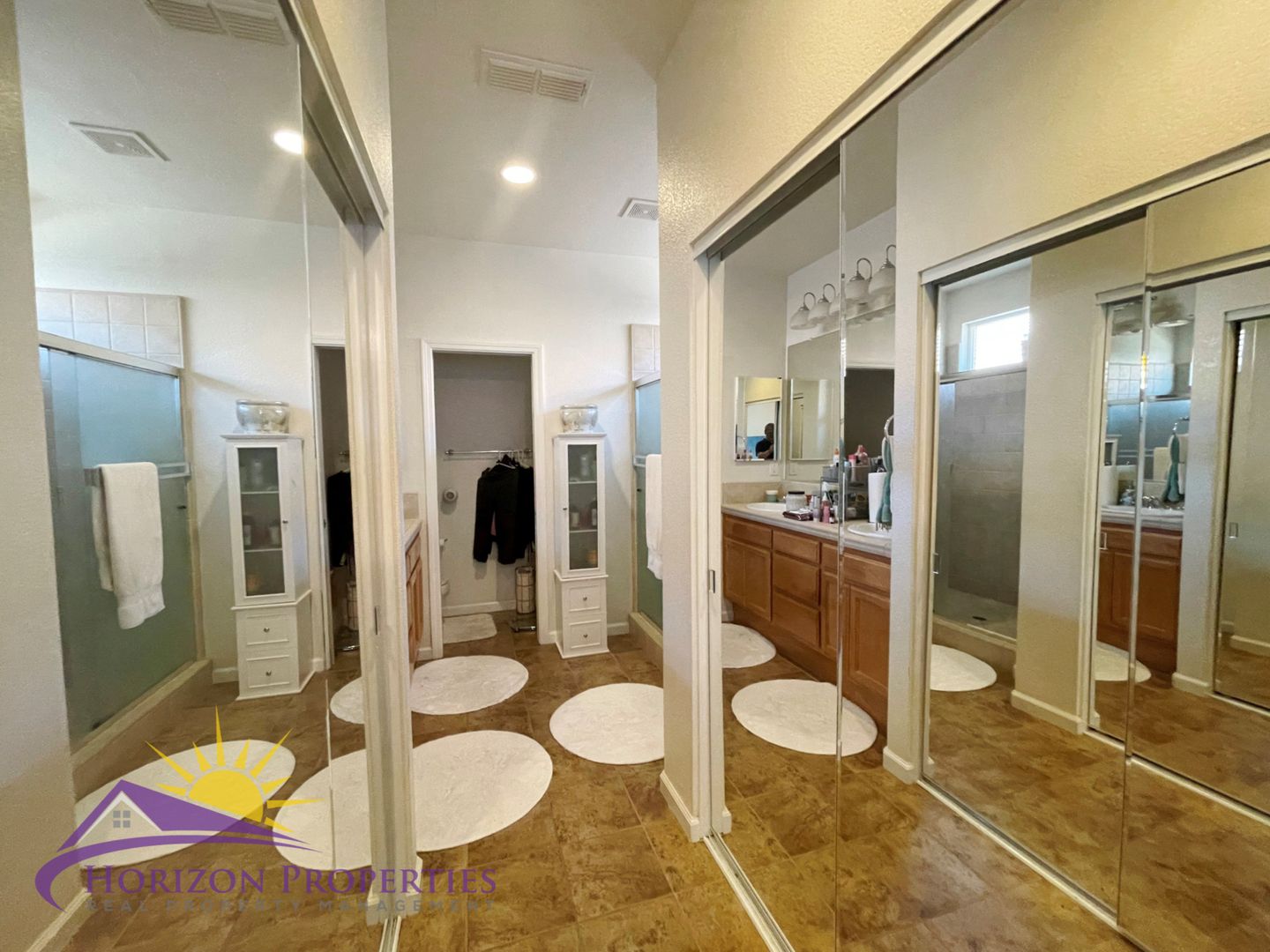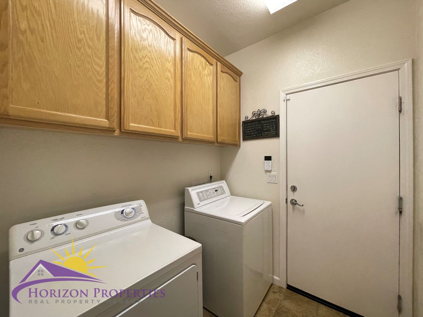 The primary bedroom has beige carpeting, vaulted ceiling, overhead lighting with ceiling fan and two, mirrored double-door closets. The primary bathroom has tile flooring, recessed lighting, tile walk-in shower with glass doors and a tile and oak dual vanity. The second and third bedrooms have beige carpeting, overhead lighting and double-door closets. The hall bathroom has tile flooring, tile shower over tub and a single vanity. The laundry room is at the end of the hall and has tile flooring, overhead lighting, built-in cabinets, door to the garage and is equipped with both washer and dryer.