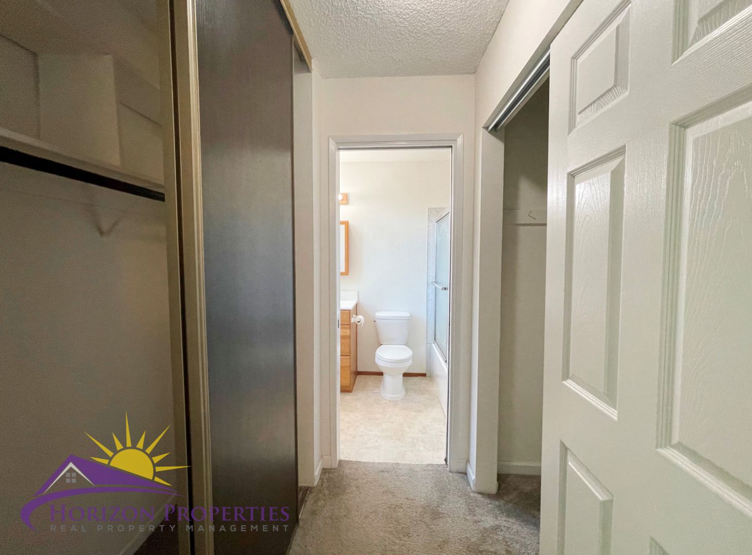 The primary bedroom has gray carpeting, overhead lighting and a mirrored double-door closet. The primary bathroom has linoleum flooring, overhead lighting, shower over tub with sliding glass doors and a single vanity. The second bedroom has gray carpeting, overhead lighting and a double-door closet. The hall bathroom has linoleum flooring, overhead lighting, walk-in shower with glass doors and a single vanity. The hallway has built-in linen cabinets.
