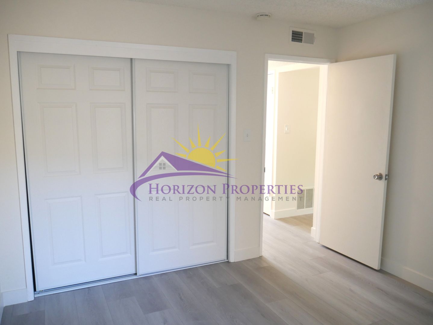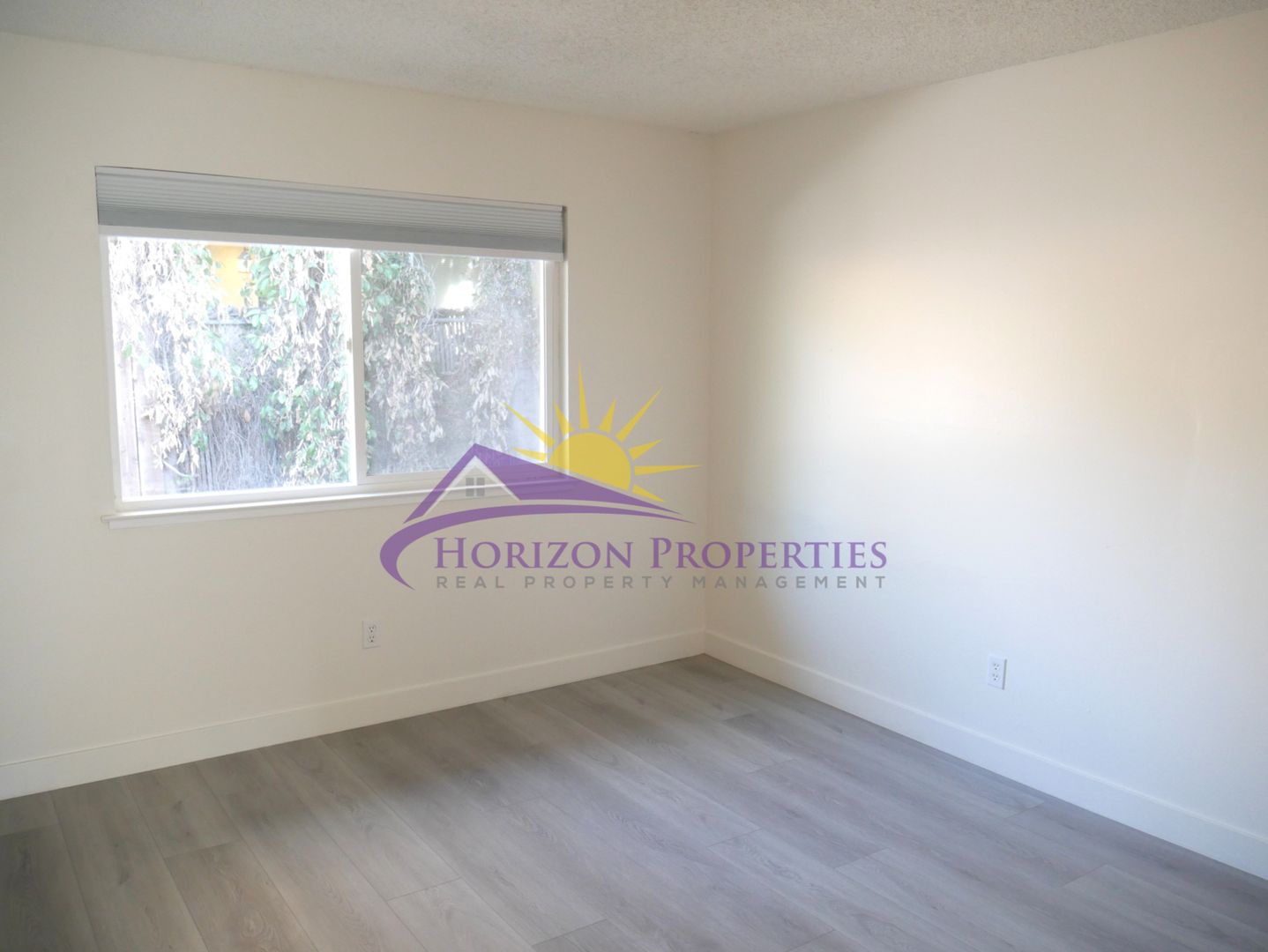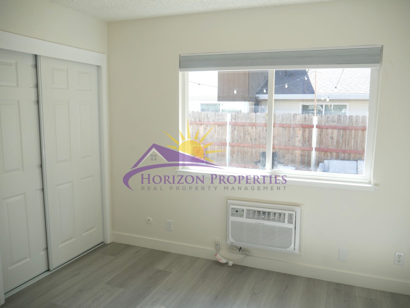 Near Northrop Avenue and Fulton Avenue in the Arden area, Sacramento, this remodeled fourplex unit offers two bedrooms and one bathroom. The entry opens onto new laminate flooring, dual pane windows, new closet doors, new pleated binds, central heating, 2 wall air conditioning units, and fresh paint throughout 700 square feet of living space. The living room has a in wall air conditioning unit and the dining room has overhead lighting.