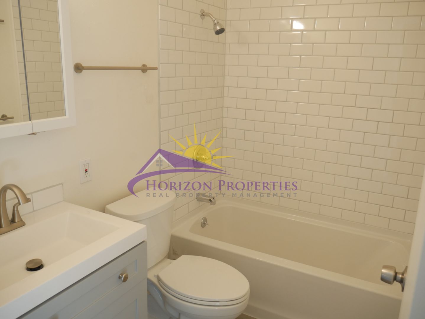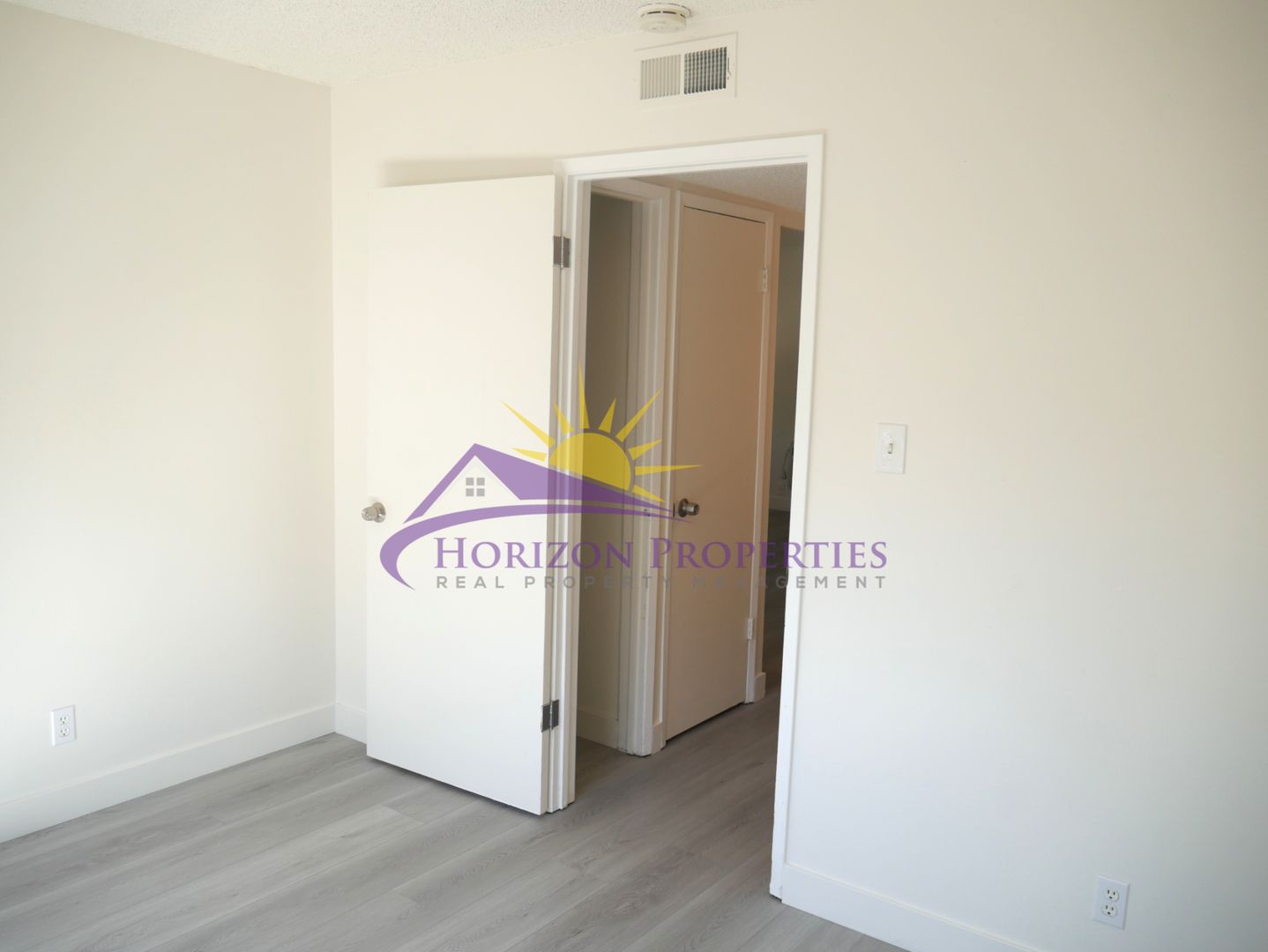 The first bedroom has two double door closets and in wall air conditioning unit. The bathroom is all new with a tiled shower over tub and corian vanity with tile backsplash. The second bedroom has a double door closet.