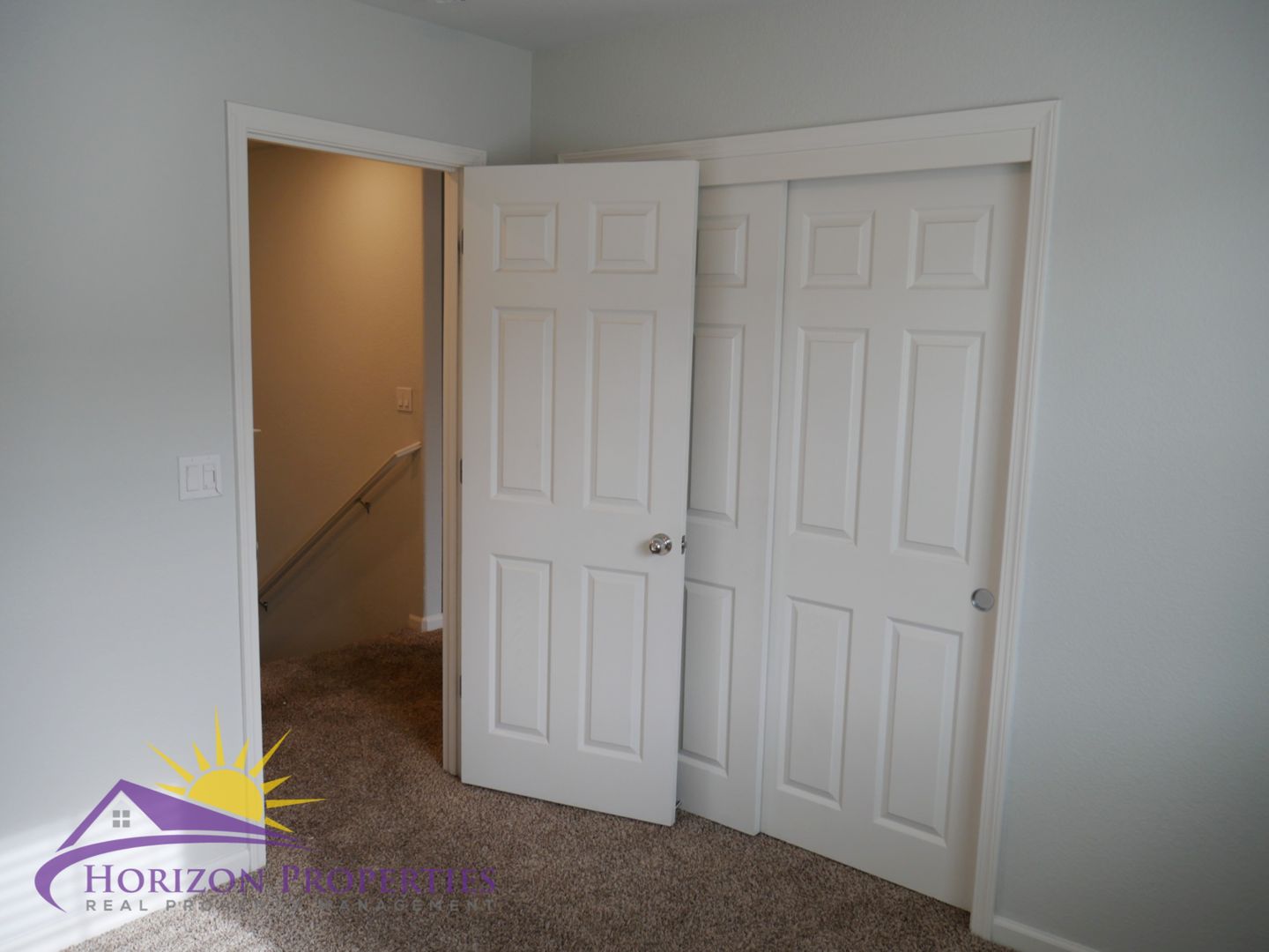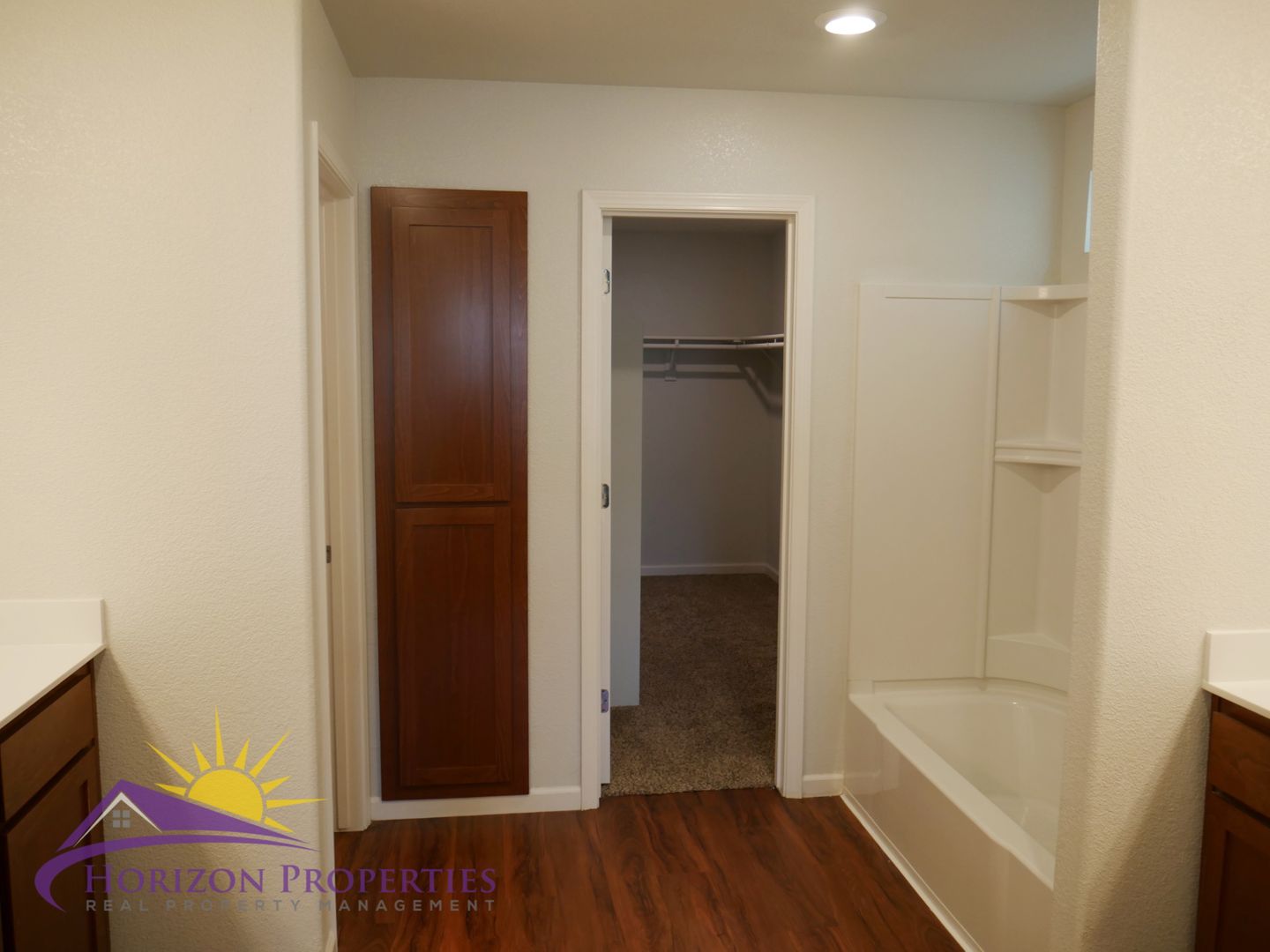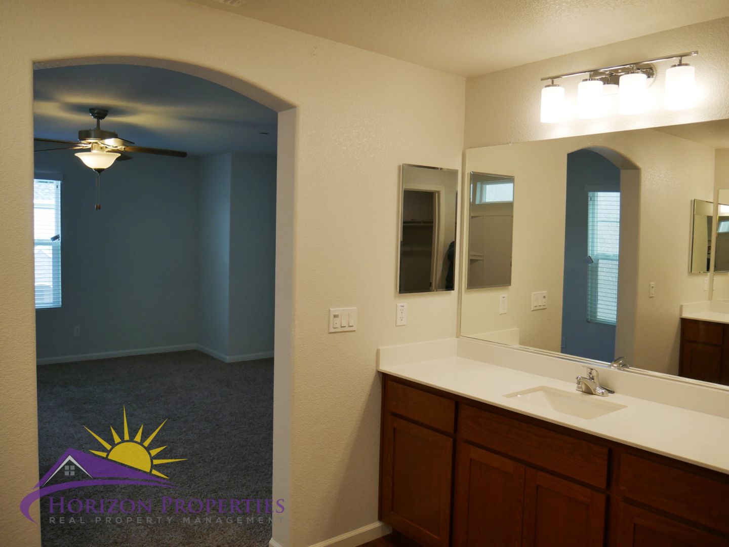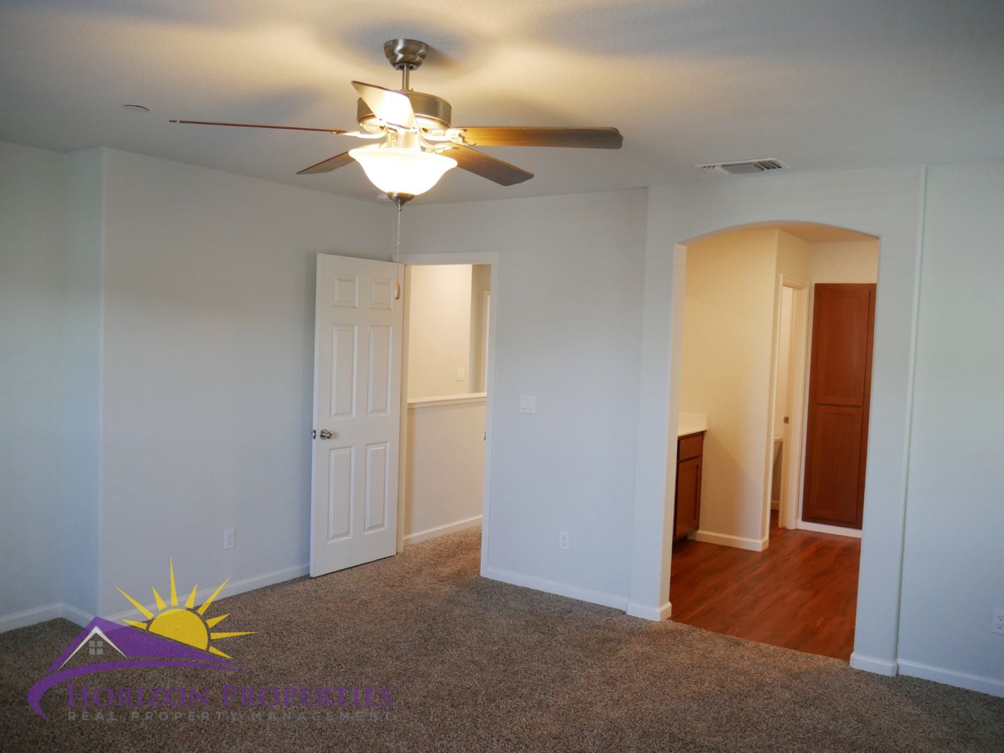 The primary bedroom is located upstairs and has oatmeal carpeting, overhead ceiling fan and a furniture niche. The primary bathroom has laminate flooring, shower over tub, separate vanities, large walk-in closet and a linen cabinet. The second bedroom has oatmeal carpeting, furniture niche and a walk-in closet. The third and fourth bedrooms are located downstairs and have oatmeal carpeting and double door closets. The hall bathroom has a laminate flooring and a shower over tub. The half bathroom has laminate flooring, pedestal sink and an oval mirror.