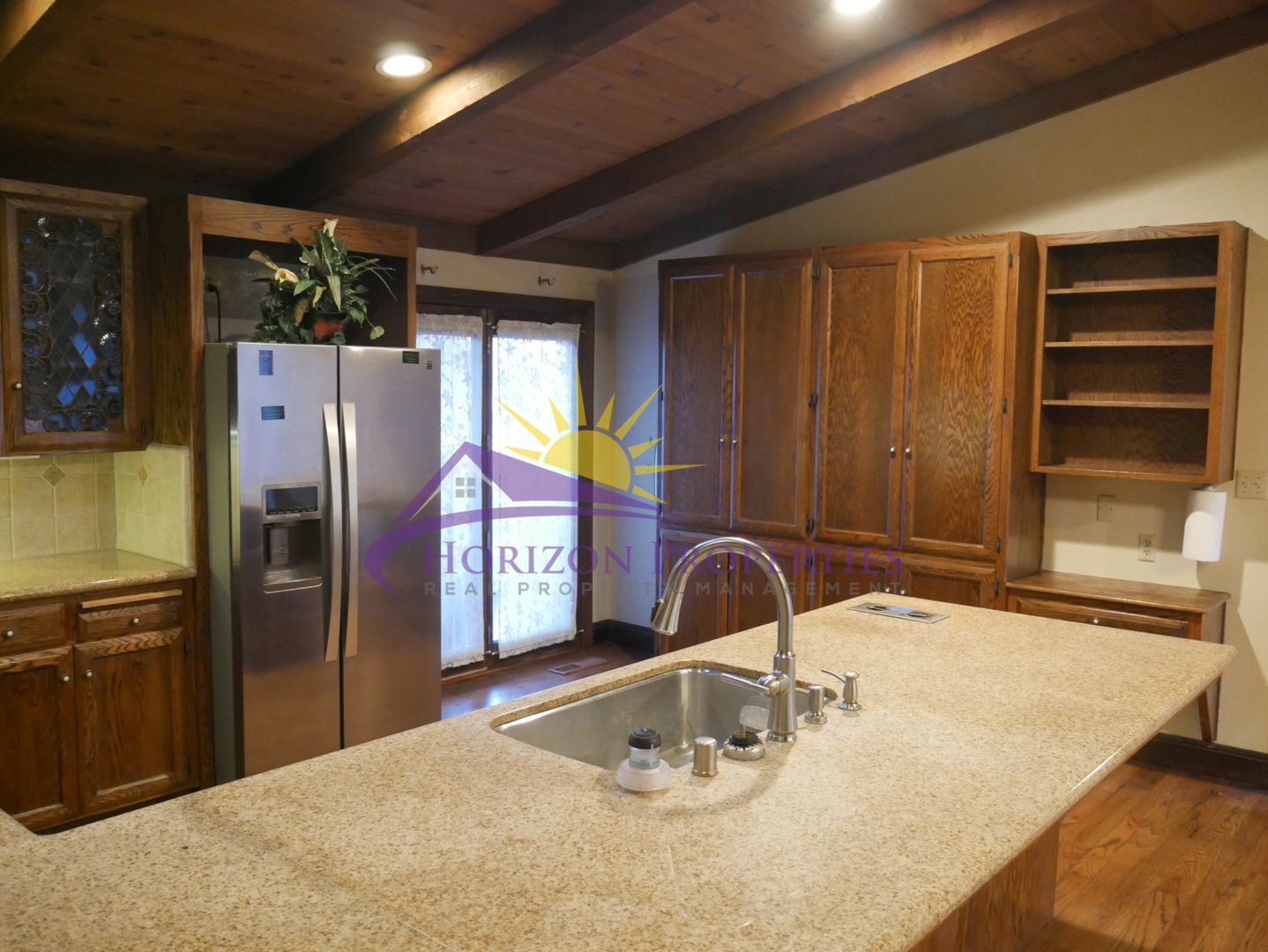 The eat-in kitchen has hardwood flooring, granite counters, lots of dark oak cabinets, pullouts, plant shelves, leaded glass cabinet doors, tile backsplash, french door to front patio, and is equipped with:
