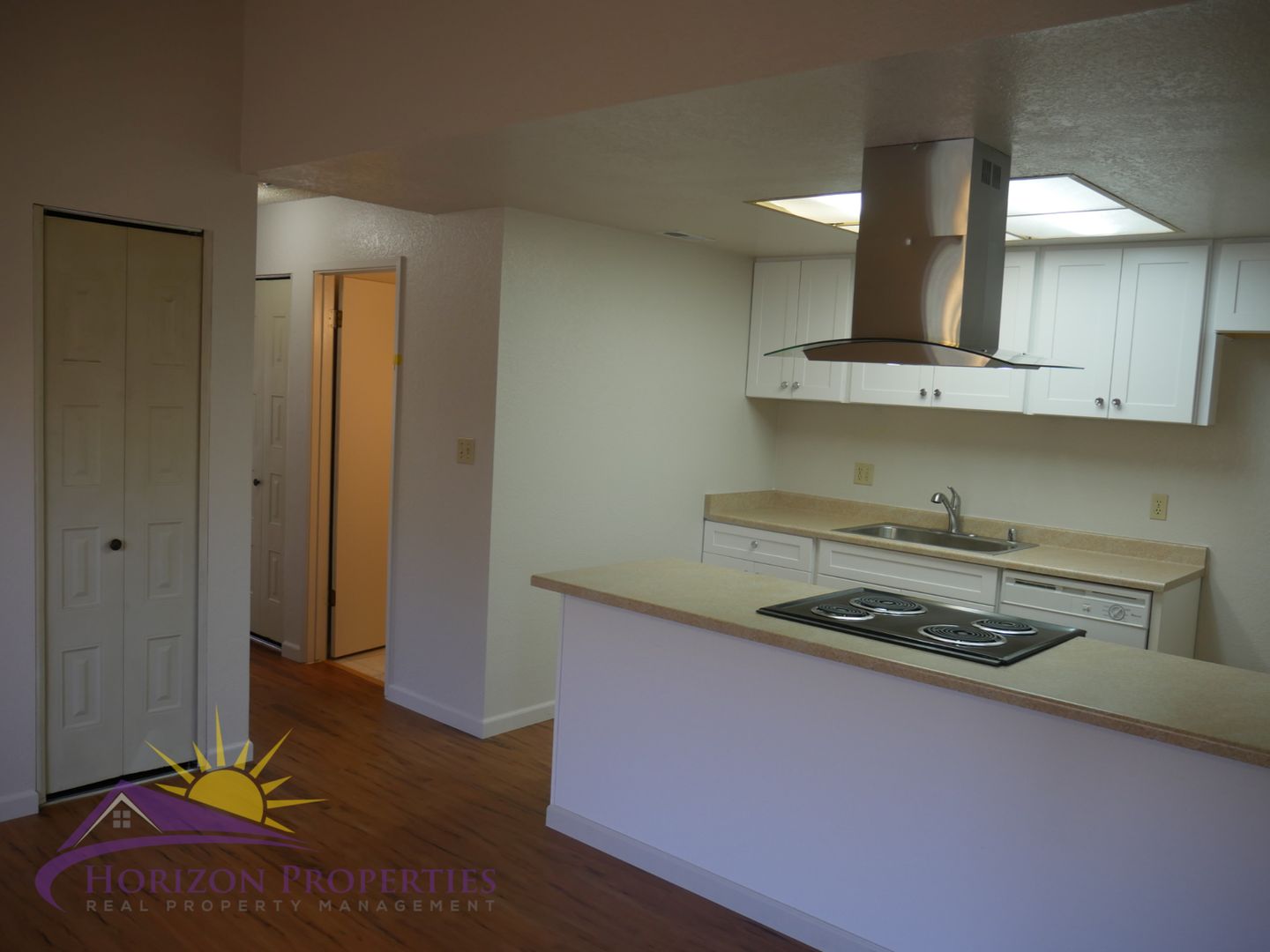 The kitchen has laminate flooring, frosted shaker cabinets, and formica counters, and is equipped with: