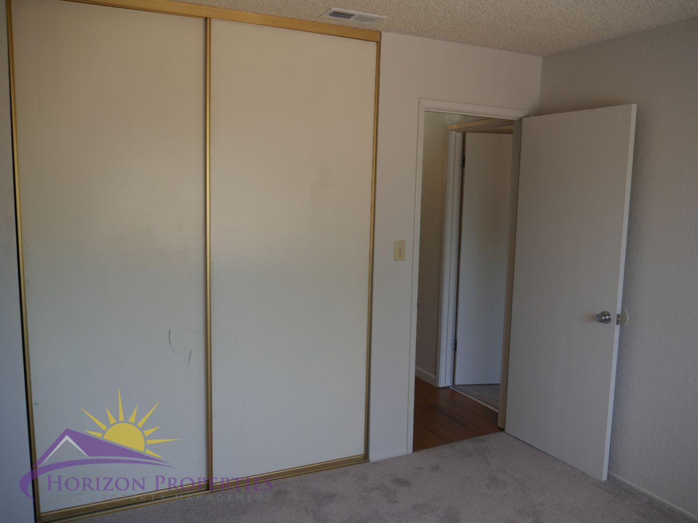 Primary bedroom has grey carpet and mirrored double door closet. The second bedroom has grey carpet and a double door closet. The primary bath has tile flooring, large walk-in shower with glass doors, and a single vanity. The hall bath has tile flooring, shower over tub with glass doors, and a single vanity.