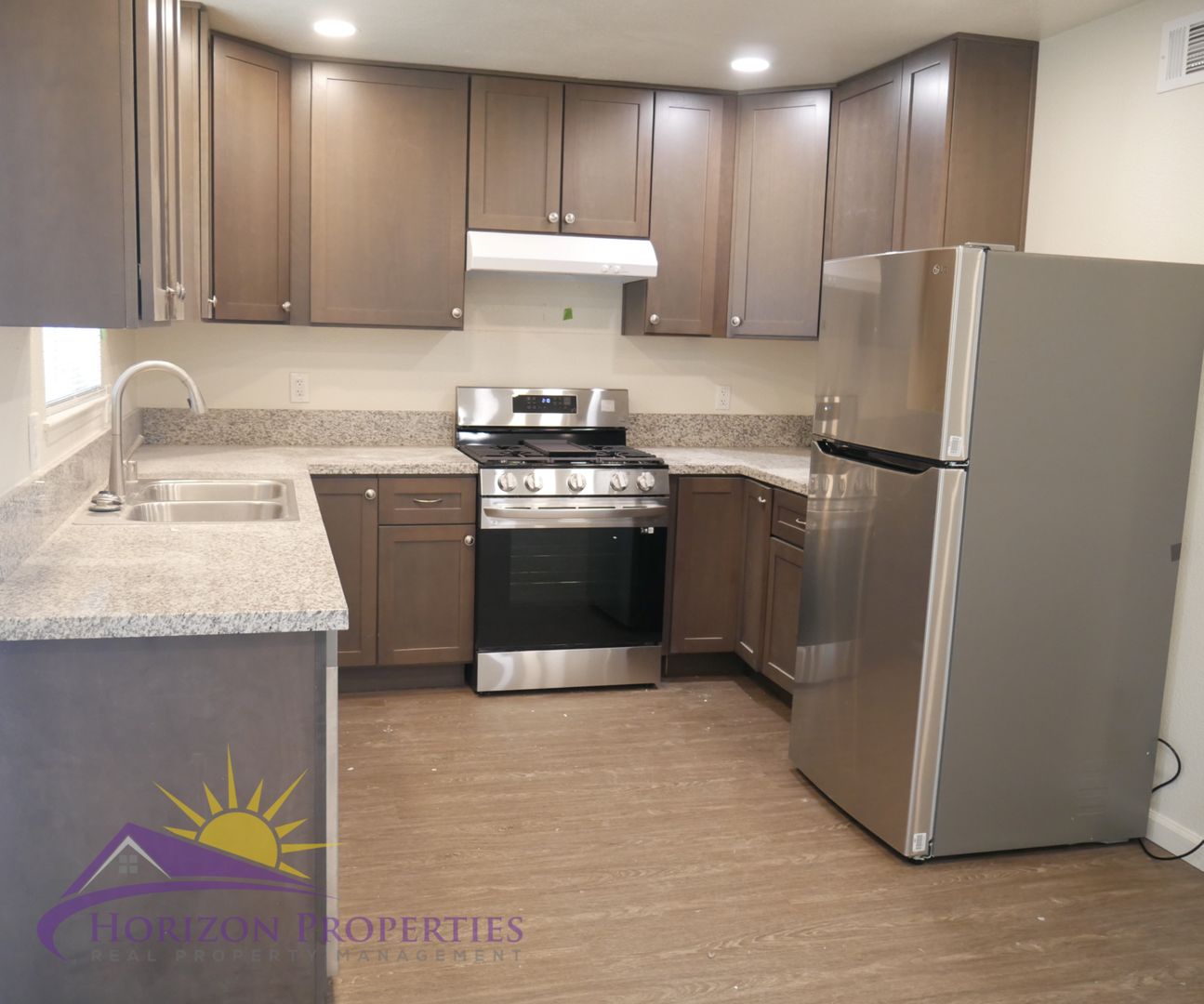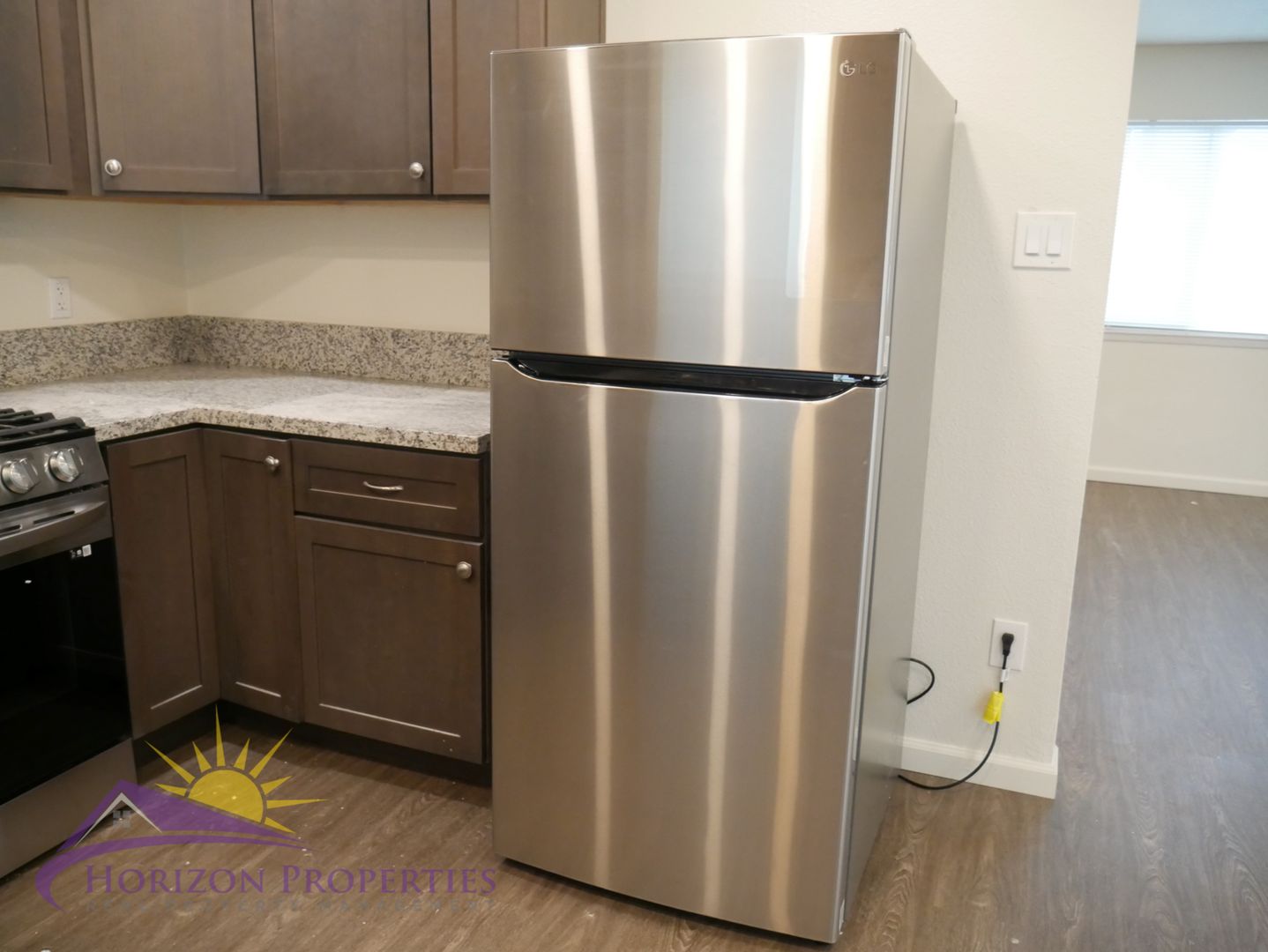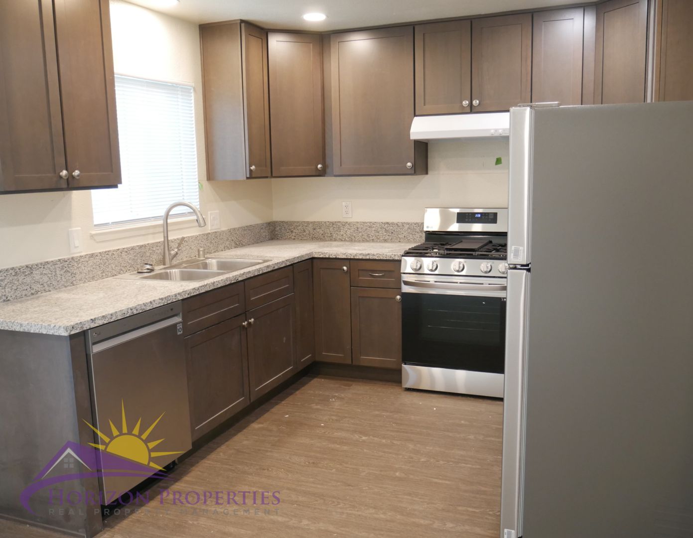 The kitchen has laminate flooring, wood cabinets that have soft close door, a lazy susan and granite counters, and is equipped with all new appliances: