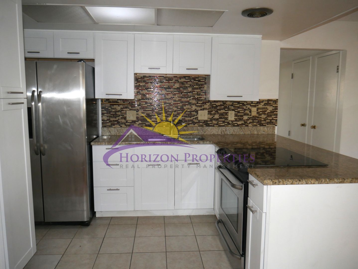 The kitchen has tile flooring, wood cabinets, granite counters with polished glass and mosaic backsplash, and is equipped with: