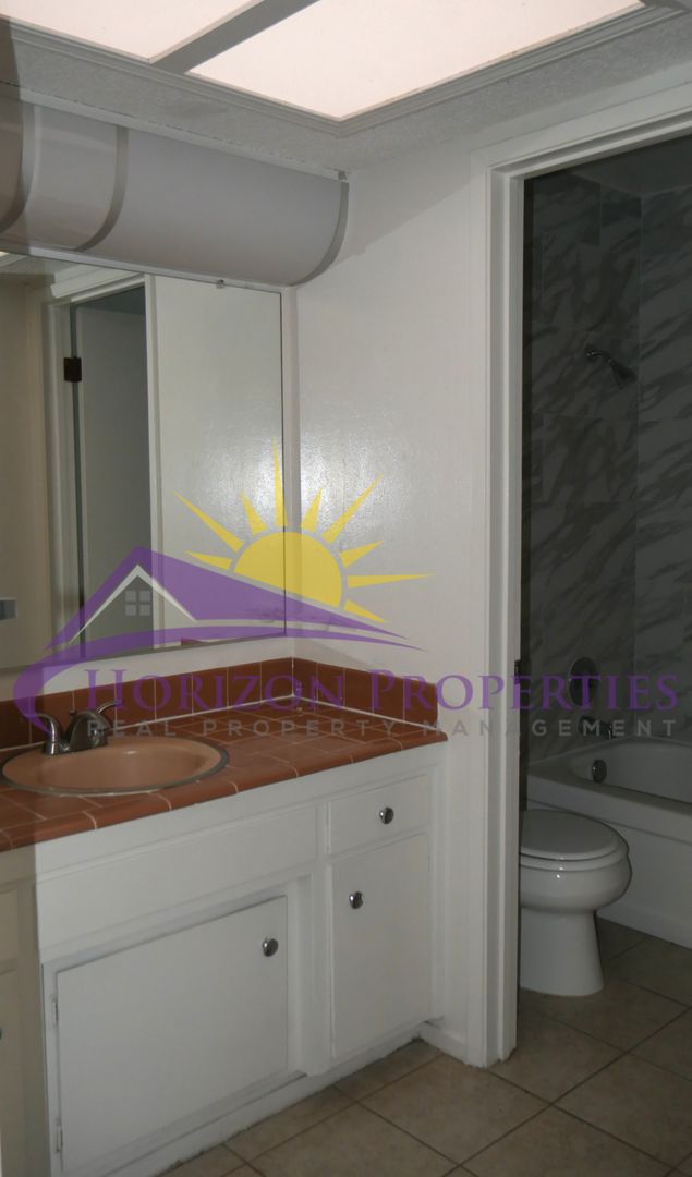 The primary bedroom has a closet that runs the length of the wall with four doors and overhead lighting. The bathroom has tile flooring, tiled shower over tub and a tiled vanity. The second bedroom has overhead lighting and a double door closet.