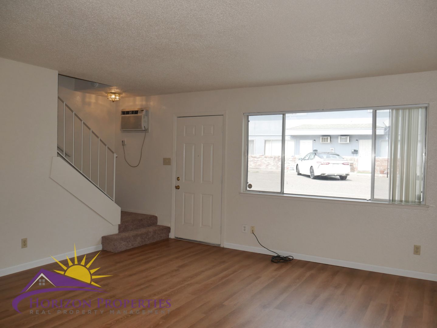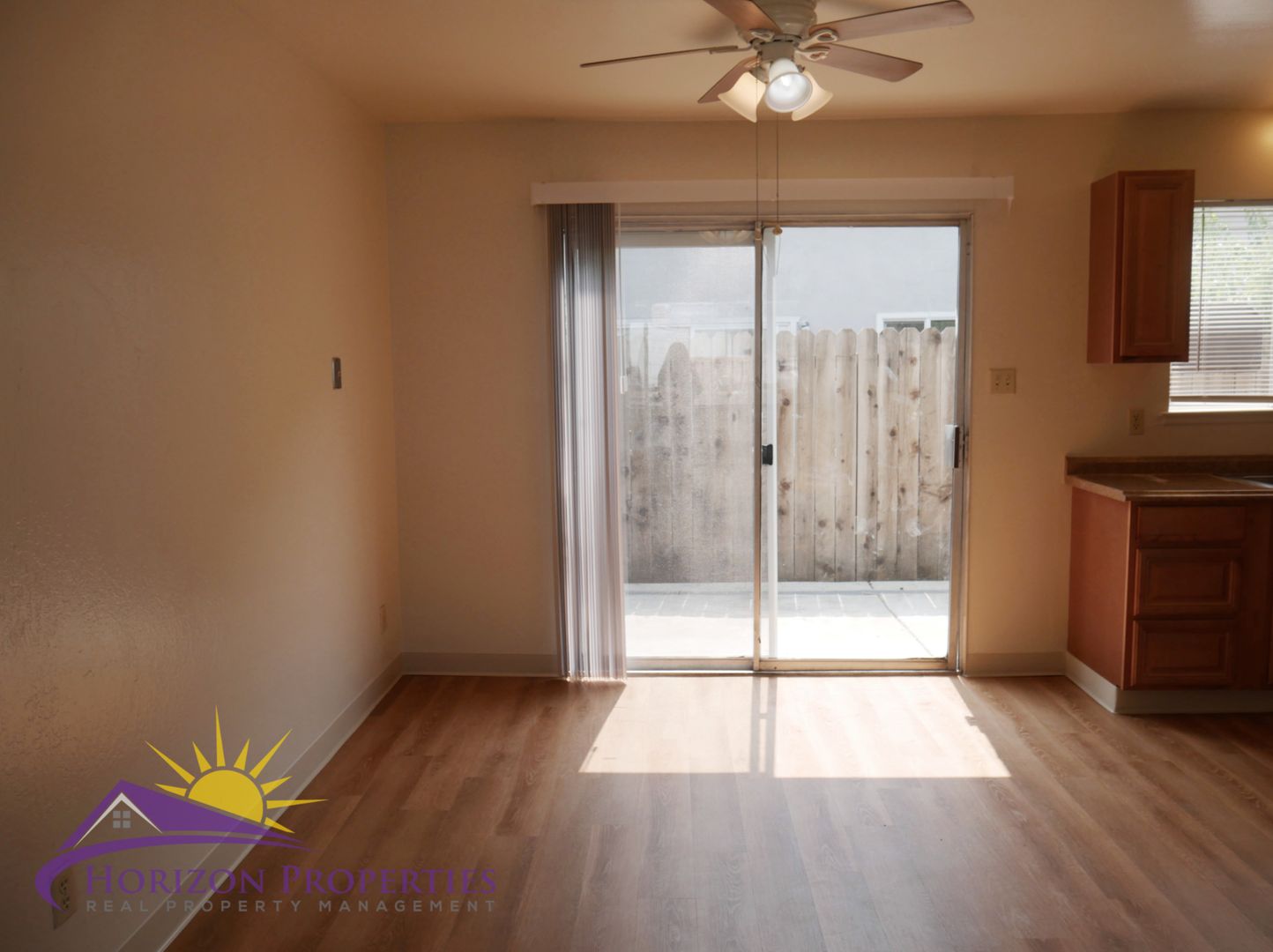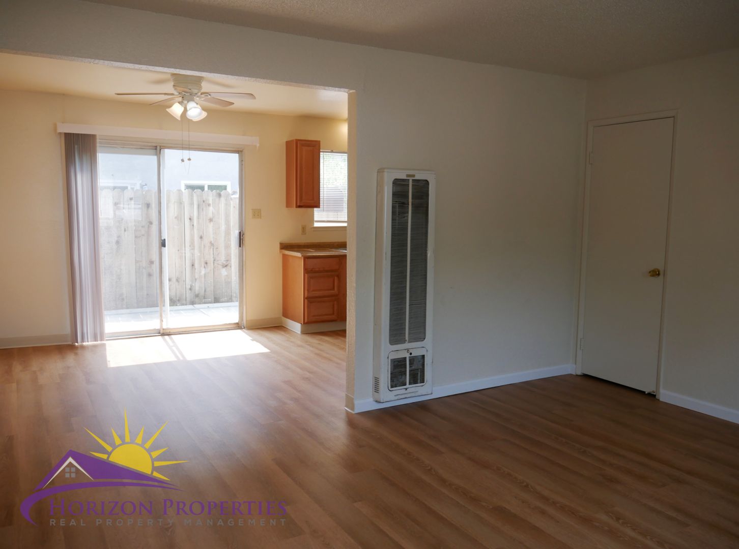 Near Natoma Street and Fargo Way in Sierra Woods, Folsom, this open, two-story fourplex offers two bedrooms and one full bathroom. This home has window air and wall heat. The entry has a security door and opens onto luxury vinyl plank flooring downstairs and beige carpeting upstairs, miniblinds and verticals throughout 918 square feet of living space. The living room has a closet under the stairs. The dining room has overhead lighting with ceiling fan and a sliding glass door to the rear patio.