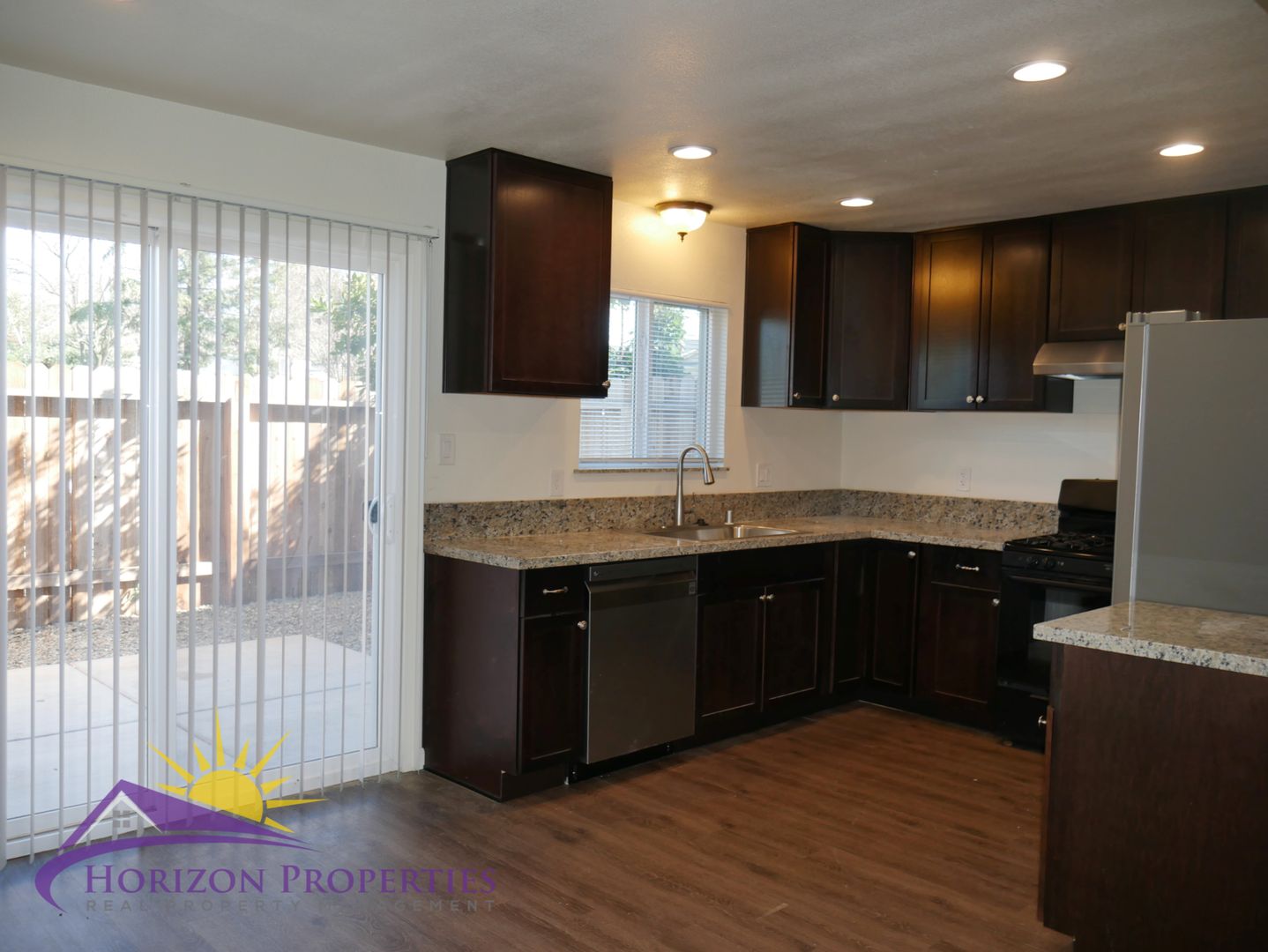 The kitchen has laminate flooring, espresso cabinets with under-cabinet lighting, granite counters and back-splash and is equipped with: