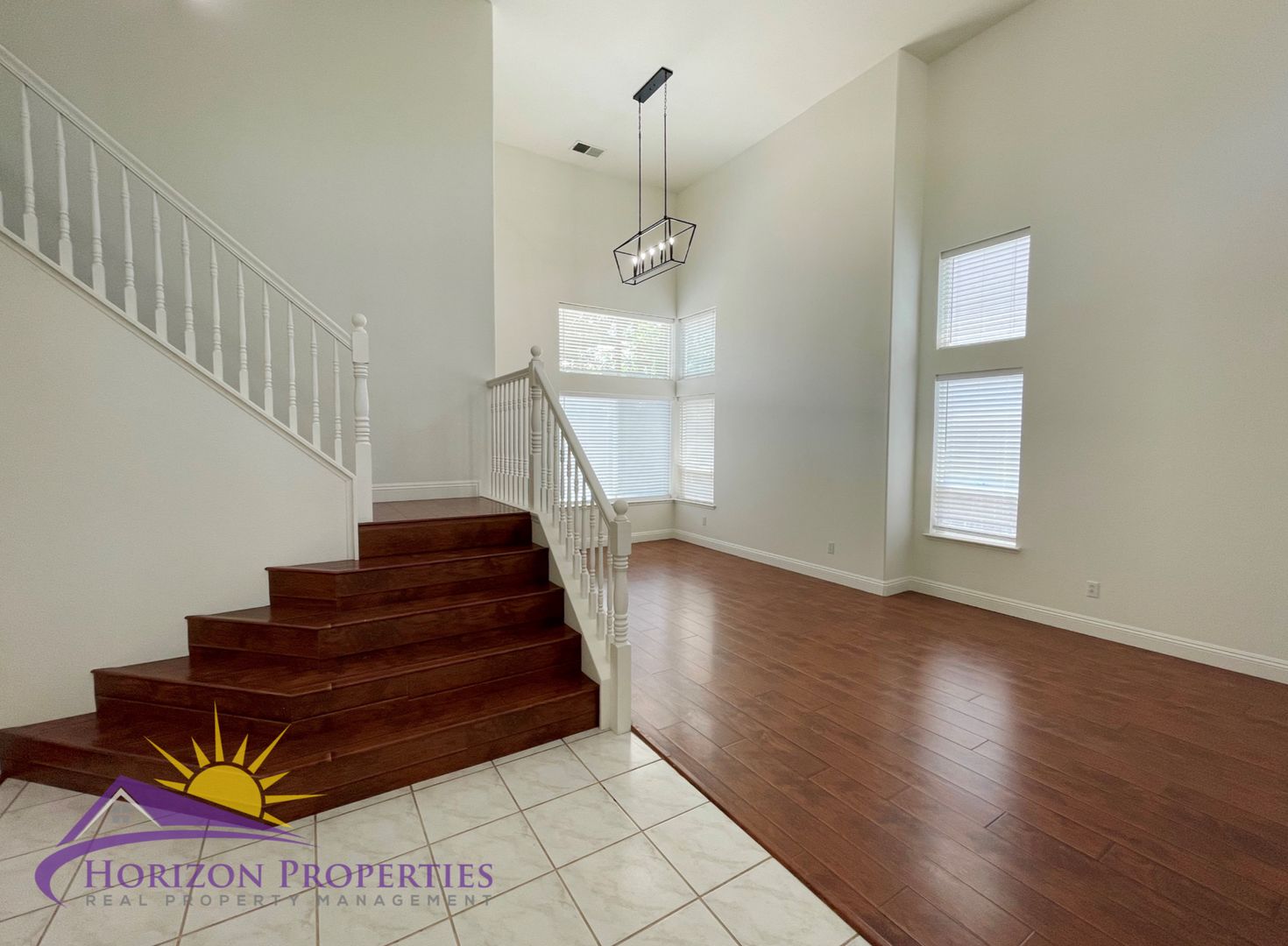 Near Sheldon Road and E. Stockton Boulevard in Sheldon Pacific, Elk Grove, this spacious, two-story single family home offers five bedrooms and three full bathrooms. This home has dual, programmable, central heat and air conditioning. The covered front patio opens onto tile and laminate flooring, cathedral ceilings, matching designer chandeliers and dual pane windows with vertical blinds throughout 2,136 square feet of living space. The spacious living room has laminate flooring, wall niche and a beautiful staircase leading to the second floor. The dining room has laminate flooring, designer chandelier and a doorway to the kitchen. The family room is adjacent to the kitchen and has laminate flooring, tile gas fireplace and a slider to the rear yard. The breakfast nook is in the kitchen and has tile flooring and a designer chandelier.